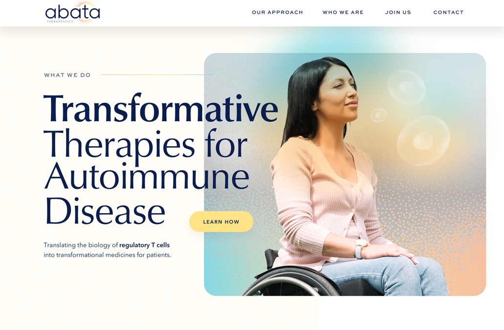 When we began our partnership with Abata Therapeutics, the company was just coming out of stealth mode with its new approach to the treatment of autoimmune disease by engineering Tregs. Our discovery work surfaced two important themes that we kept front and center as we developed the brand. First, Abata’s story is centered around people. While science is core to what Abata does, its mission is to make life better for patients who don’t currently have any effective therapies available to them. Our designers expressed this mission through visuals that feature human-centric imagery over clinical scientific images. We also knew that Abata would be launching in a crowded and competitive space and our task was to design a brand that would stand out. Here we leaned on the translation of Abata as “tranquil” or “a place of peace.” Every design choice was made to support a calm, human, and welcoming visual narrative—in contrast to a tech-heavy approach commonly seen in the competitive landscape.