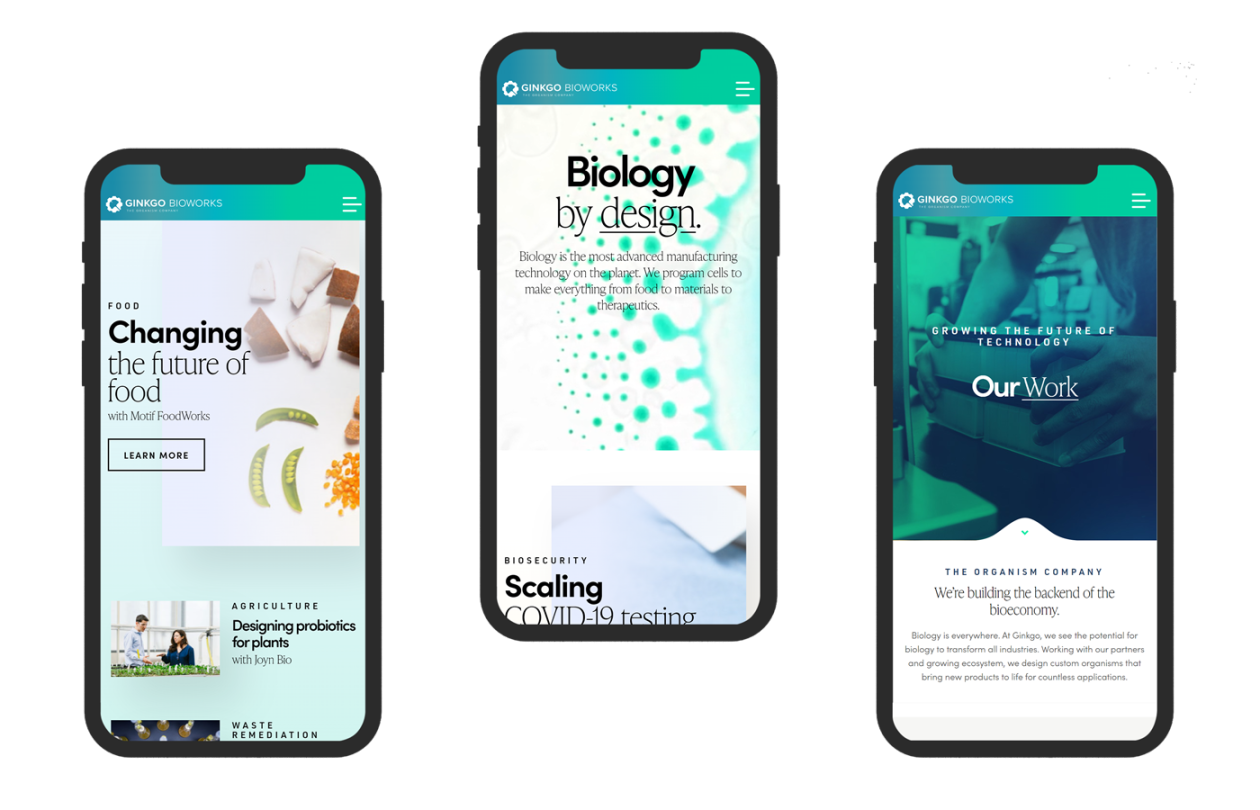Our creative digital designers and strategists worked closely with Ginkgo Bioworks’ stakeholders (founders, scientists, designers, and strategists, to name a few) to help build the brand that put synthetic biology on the map and created a whole new category in biotechnology. We started with a quick iteration to meet a tight deadline, and have continued to expand and evolve their digital brand over the years.