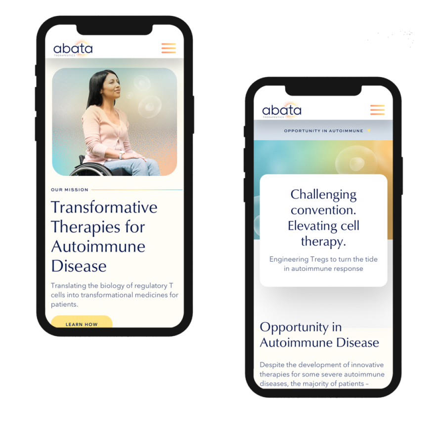 Abata’s challenge was not only brand focused. Our development team built a website that will flex and grow as the company advances their programs to clinical trials and then to market. The site’s modular, flexible UI and backend dev systems support an ever changing, ever growing company.